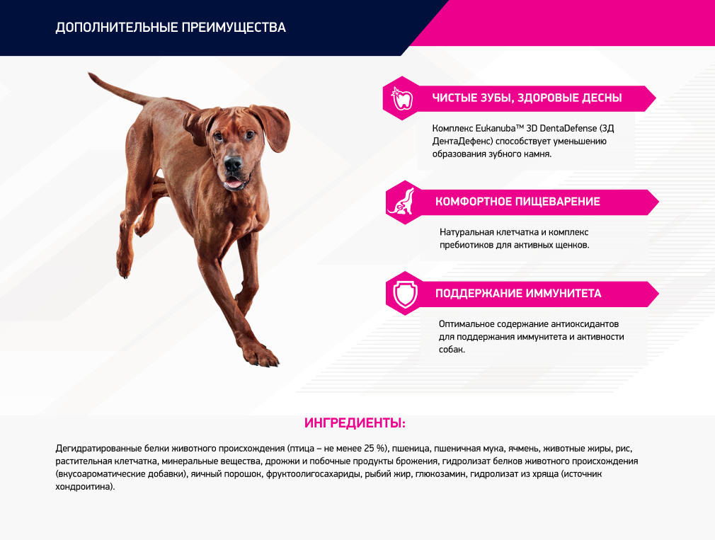 ИНГРЕДИЕНТЫ: дегидратированные белки животного происхождения (птица – не менее 25 %), пшеница, пшеничная мука, ячмень, животные жиры, рис, растительная клетчатка, минеральные вещества, дрожжи и побочные продукты брожения, гидролизат белков животного происхождения (вкусоароматические добавки), яичный порошок, фруктоолигосахариды, рыбий жир, глюкозамин, гидролизат из хряща (источник хондроитина).