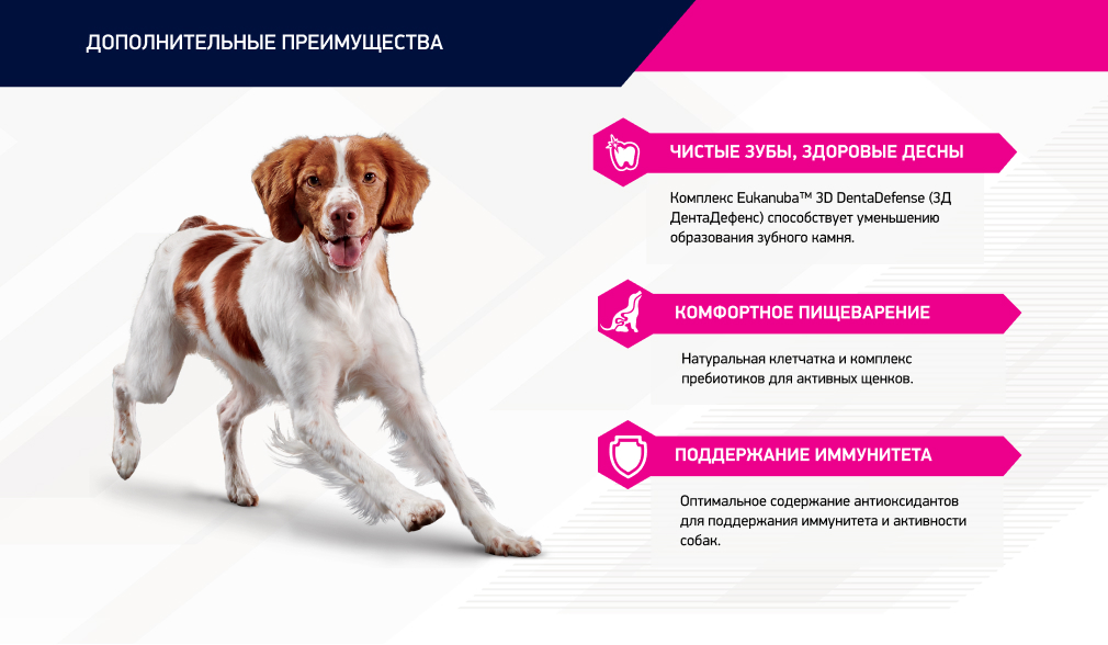 Комплекс Eukanuba™ 3D DentaDefense (3Д ДентаДефенс)  способствует уменьшению образования зубного камня.