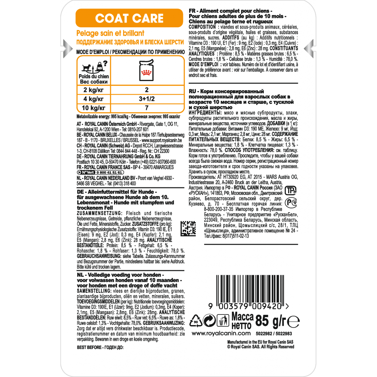ИНГРЕДИЕНТЫ: Корм консервированный полнорационный для взрослых собак в возрасте 10 месяцев и старше, с тусклой и сухой шерстью Coat Care (Коат Кэа Канин Эдалт)