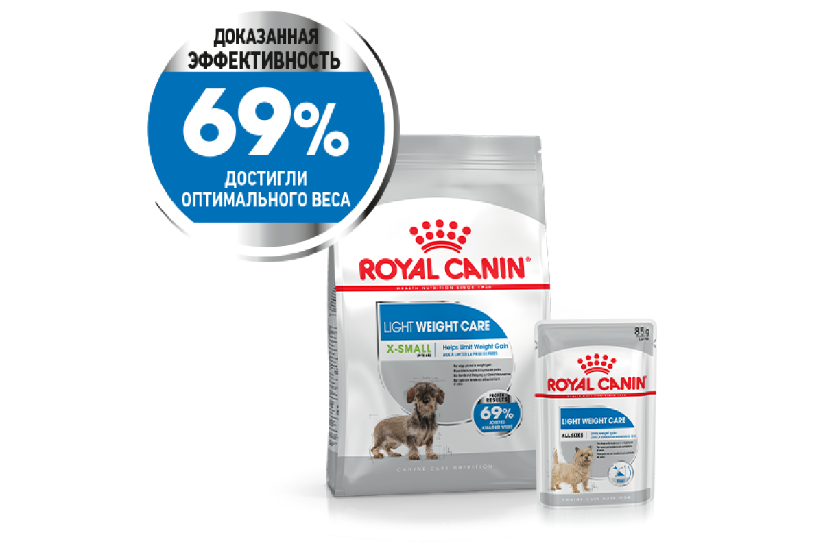 Корм ROYAL CANIN® Light Weight Care X-Small имеет доказанную эффективность. Согласно данным лабораторных исследований при употреблении корма ROYAL CANIN® Light Weight Care X-Small произошло снижение веса у 69% собак миниатюрных размеров в сравнении с обычным кормом для взрослых собак.