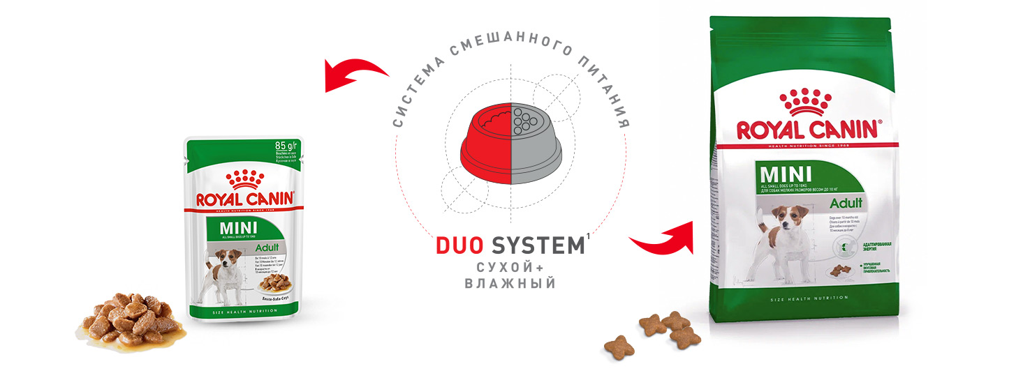 Для удовлетворения индивидуальных предпочтений каждой собаки ROYAL CANIN® Mini Adult выпускается также в формате влажного продукта – аппетитных кусочков в соусе.