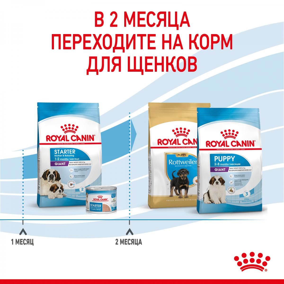 Продукт ROYAL CANIN® Giant Starter Mother & Babydog разработан с учетом потребностей в питательных веществах матери и ее новорожденных щенков. Эта формула подходит для взрослых крупных собак весом больше 45 кг, а также для щенков в возрасте до 2 месяцев.