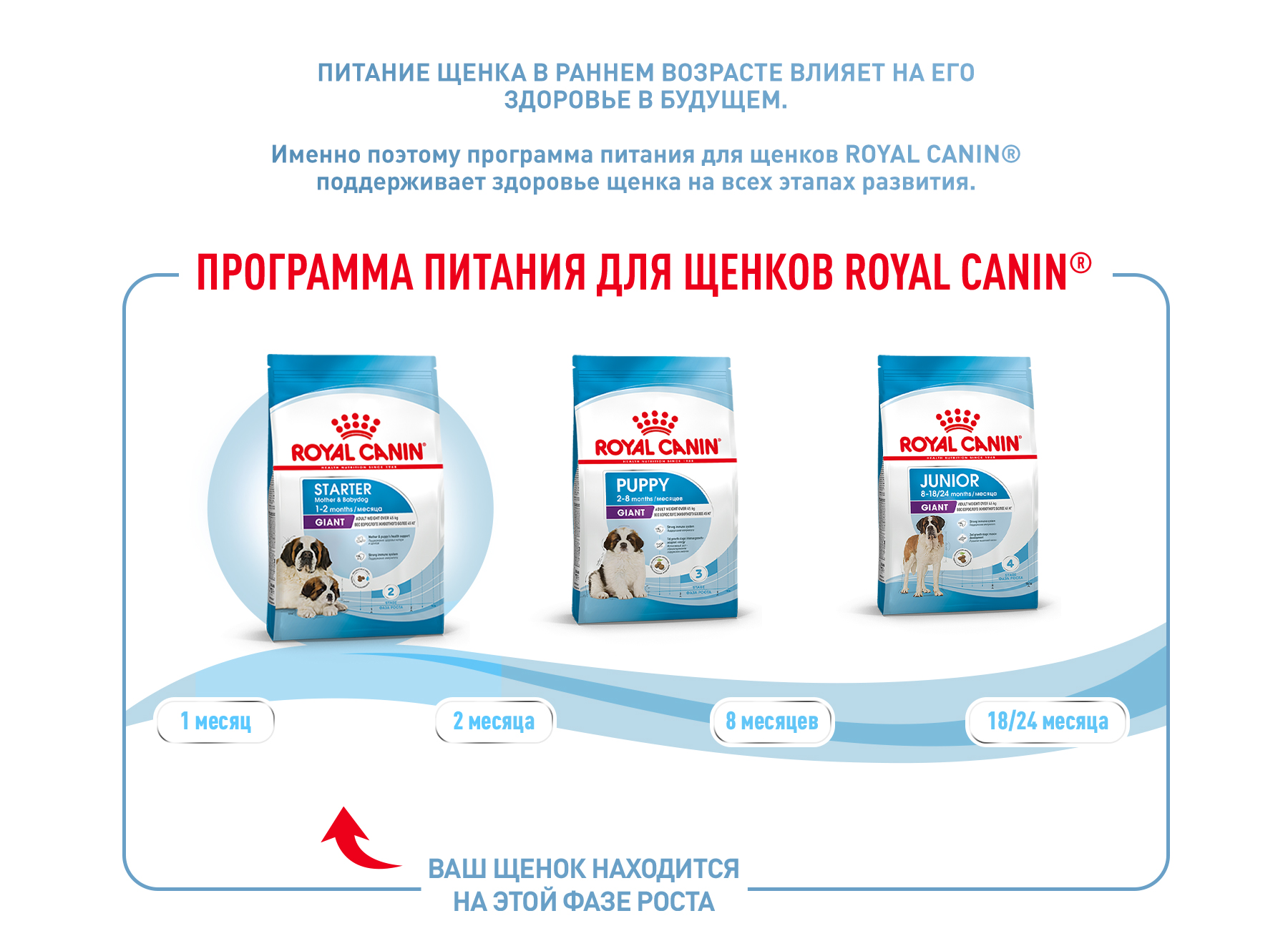 Через 8 недель потребности вашего щенка в питательных веществах изменятся. Ему будет необходим другой рацион, разработанный специально для следующей фазы роста. В этом возрасте вы сможете перевести своего питомца на сухой корм ROYAL CANIN® Giant Puppy, поддерживающий щенка в период интенсивного роста.