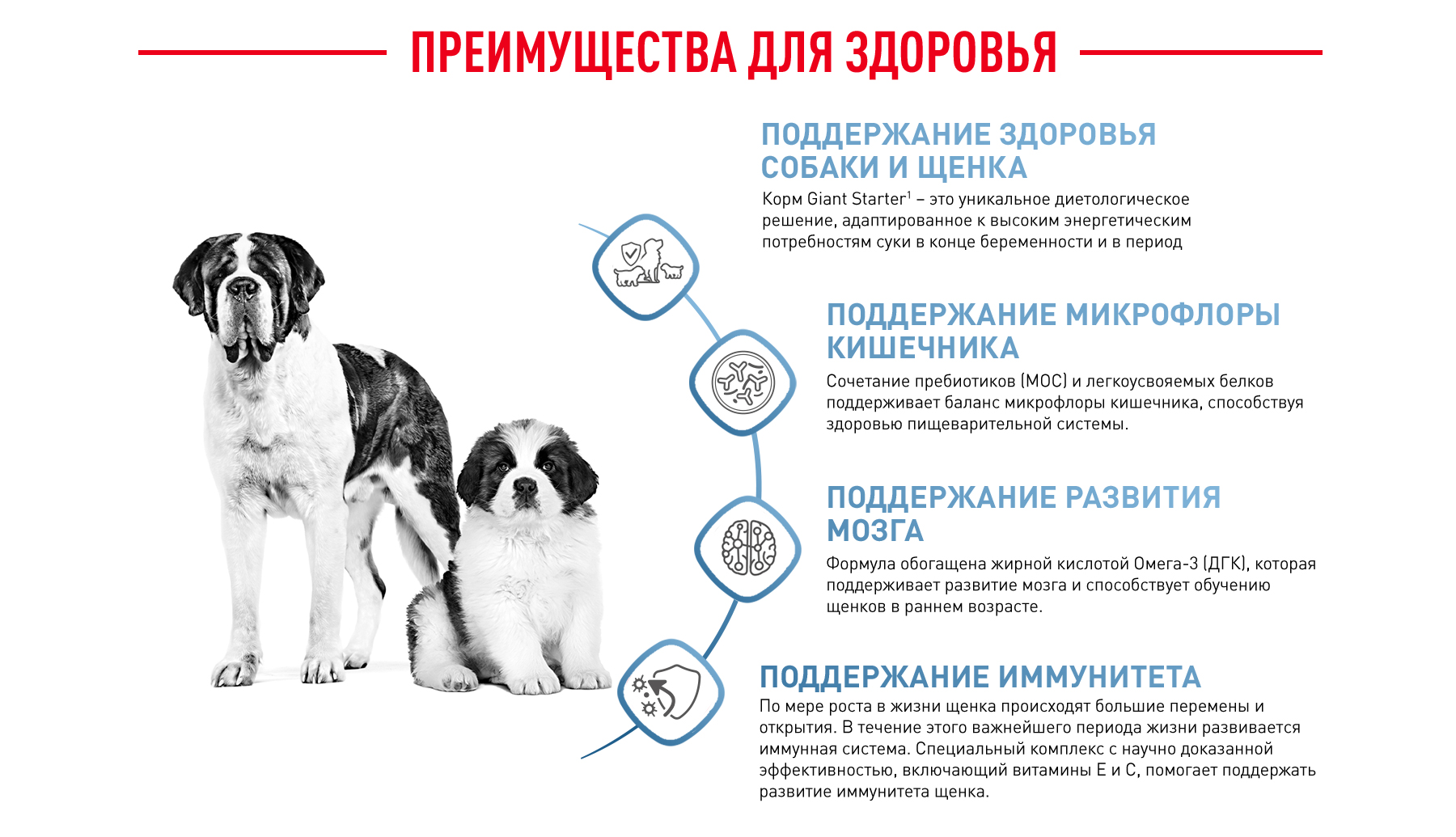 Специально разработанный рацион удовлетворяет высокие энергетические потребности матери очень крупных размеров, а также поддерживает здоровое развитие щенков, в том числе щенков из больших пометов.