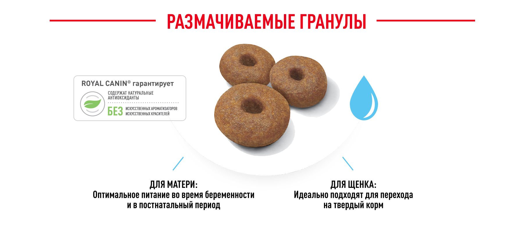 Гранулы ROYAL CANIN® Giant Starter Mother & Babydog легко размачиваются до консистенции каши и обладают высокой вкусовой привлекательностью для щенков в период отъема.