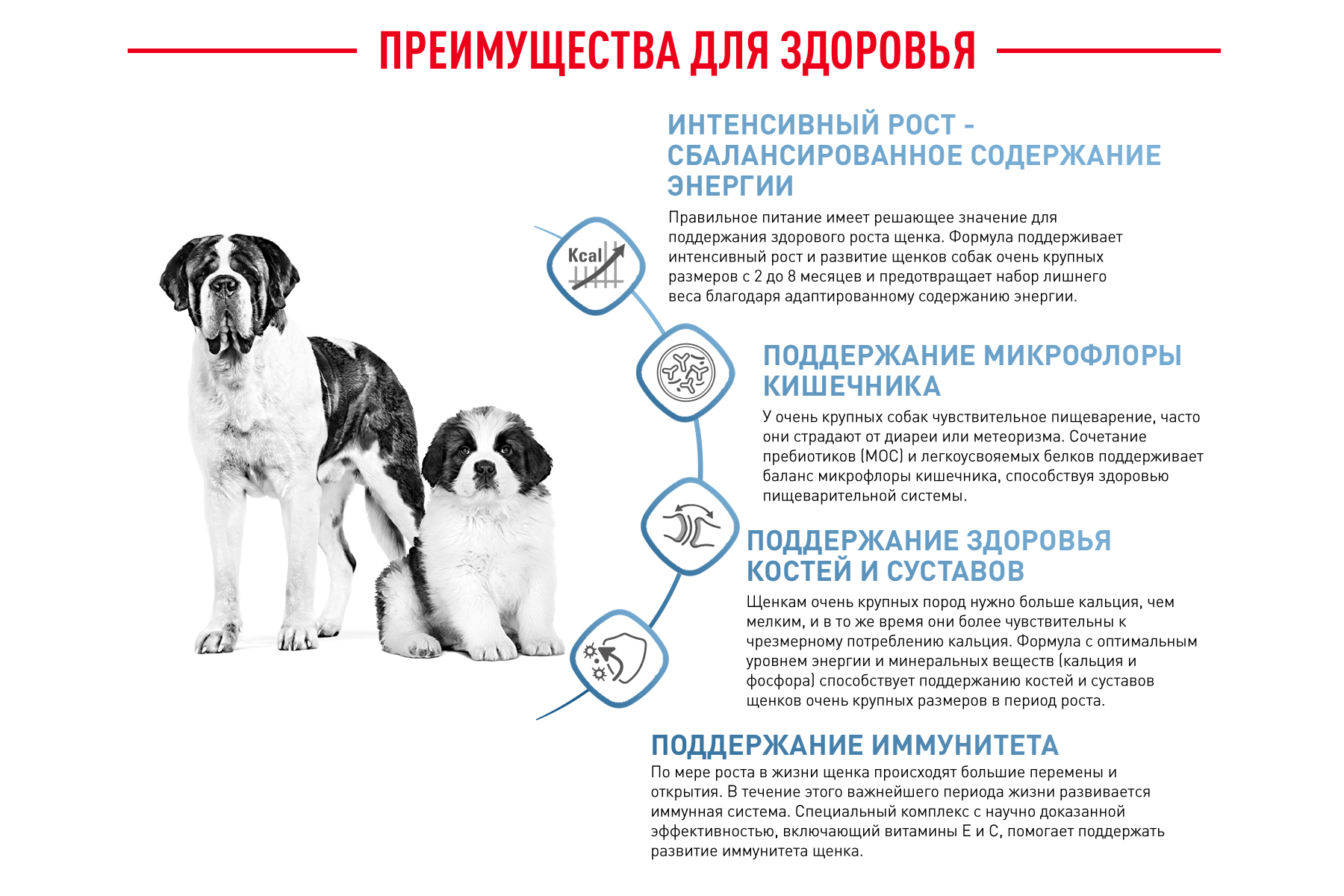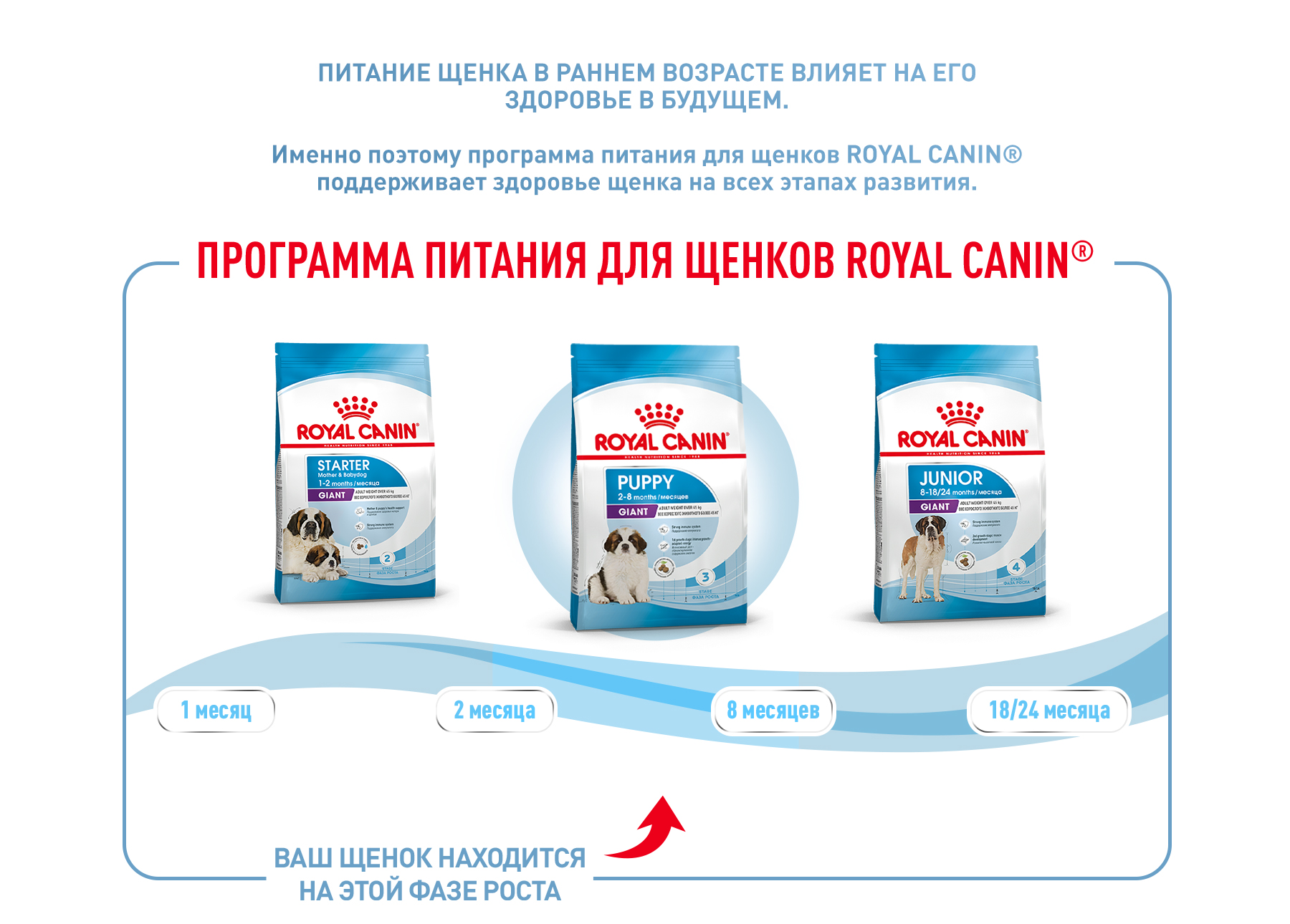 Формула продукта ROYAL CANIN® Giant Puppy разработана с учетом потребностей щенков очень крупных пород (вес взрослой собаки больше 45 кг) и подходит для щенков в возрасте от 2 до 8 месяцев.