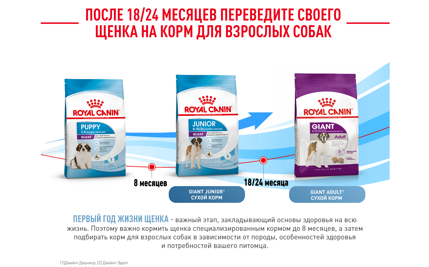 В возрасте 8 месяцев потребности вашего щенка в питательных веществах изменятся. Ему будет необходим другой рацион, разработанный специально для молодых собак очень крупных пород. В этом возрасте вы сможете перевести своего питомца на корм ROYAL CANIN® Giant Junior.