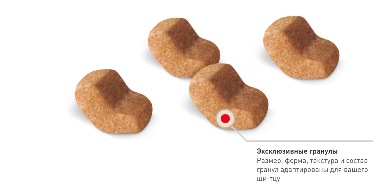 Продукт ROYAL CANIN® Shih Tzu Adult был разработан специально для собак породы Ши-Тцу, форма и размер крокет корма делают более удобным его захват и облегчают разгрызание для собак с укороченным черепом.