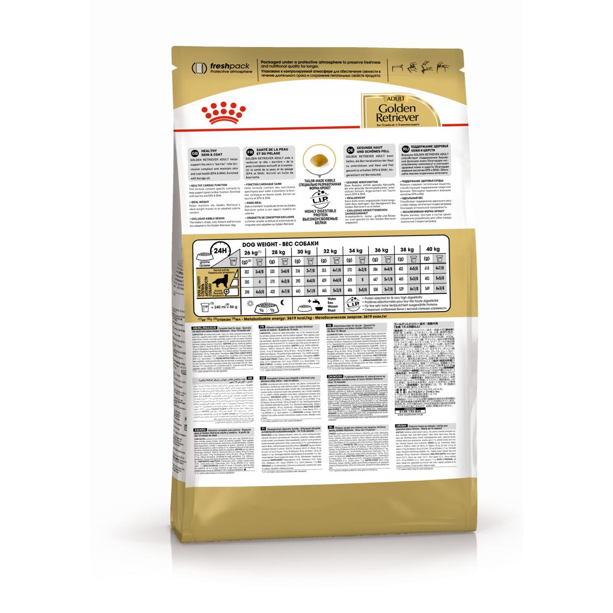 ИНГРЕДИЕНТЫ: Корм сухой полнорационный для собак - Cпециально для взрослых собак породы золотистый (голден) ретривер в возрасте 15 месяцев и старше Golden Retriever (Голден Ретривер)