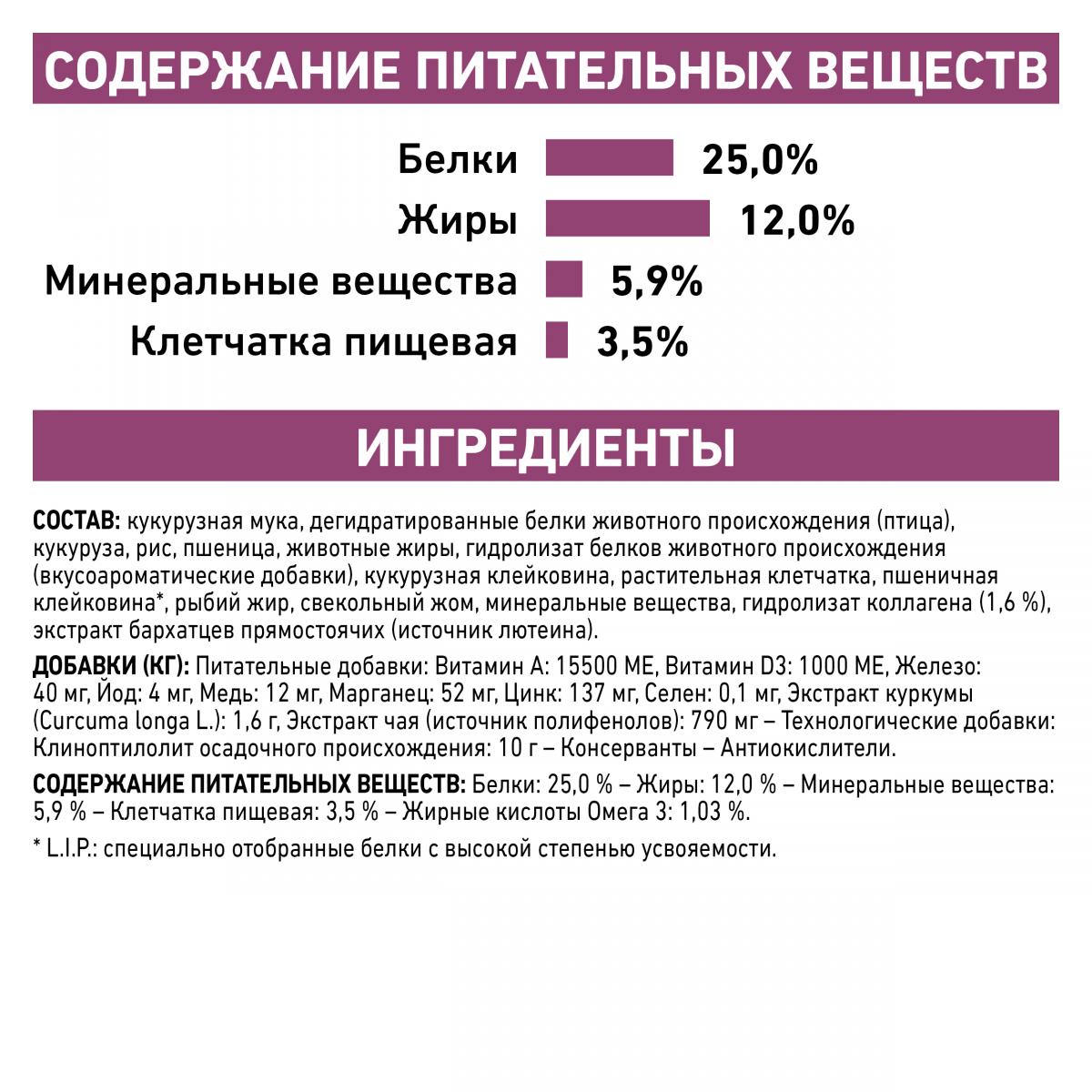 ИНГРЕДИЕНТЫ: кукурузная мука, дегидратированные белки животного происхождения (птица), кукуруза, рис, пшеница, животные жиры, гидролизат белков животного происхождения (вкусоароматические добавки), кукурузная клейковина, растительная клетчатка, пшеничная клейковина*, рыбий жир, свекольный жом, минеральные вещества, гидролизат коллагена (1,6 %), экстракт бархатцев прямостоячих (источник лютеина).