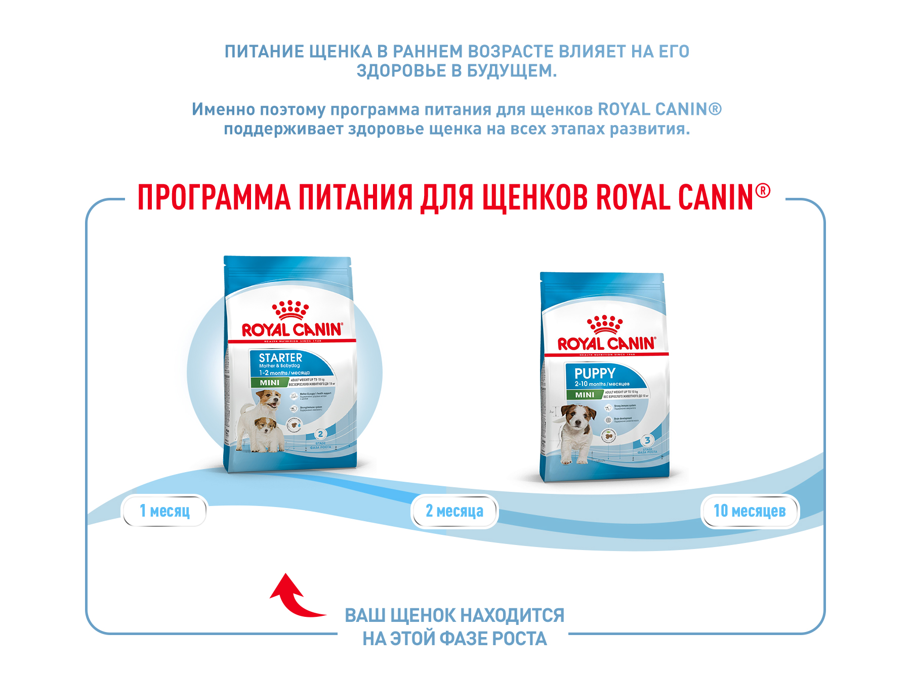 Через 8 недель потребности вашего щенка в питательных веществах изменятся. Ему будет необходим другой рацион, разработанный специально для следующей фазы роста. В этом возрасте вы сможете перевести своего питомца на корм ROYAL CANIN® Mini Puppy.