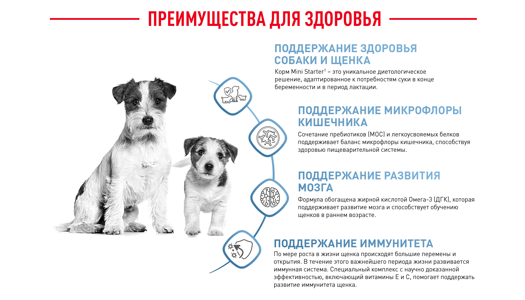 Специально разработанный рацион удовлетворяет высокие энергетические потребности матери мелких размеров, а также поддерживает здоровое развитие новорожденных щенков.