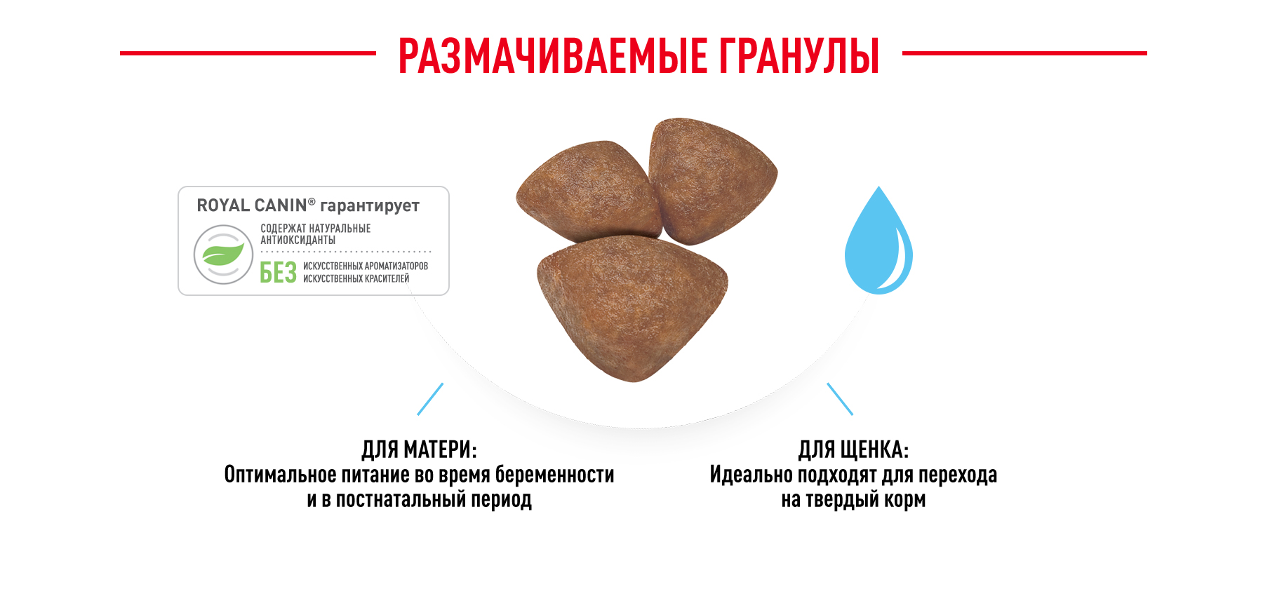 Гранулы ROYAL CANIN® Mini Starter Mother & Babydog легко размачиваются до консистенции каши и обладают высокой вкусовой привлекательностью для щенков в период отъема.