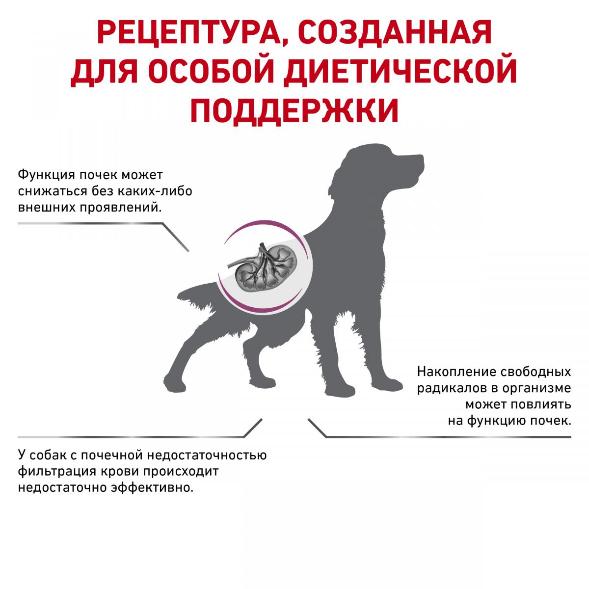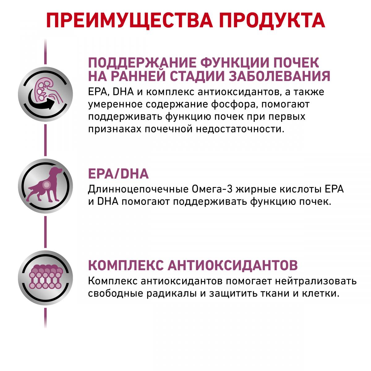 Развитие почечной недостаточности у собаки происходит без видимых симптомов. Поддержать здоровье питомца на ранней стадии развития хронической болезни почек способна правильно подобранная диетотерапия. Продукт Royal Canin Early Renal содержит умеренное количество фосфора, а также Омега-3 жирные кислоты EPA, DHA , которые помогают поддерживать функцию почек при первых признаках недостаточности. Комплекс антиоксидантов в составе корма помогает нейтрализовать свободные радикалы и защитить ткани и клетки от повреждений.