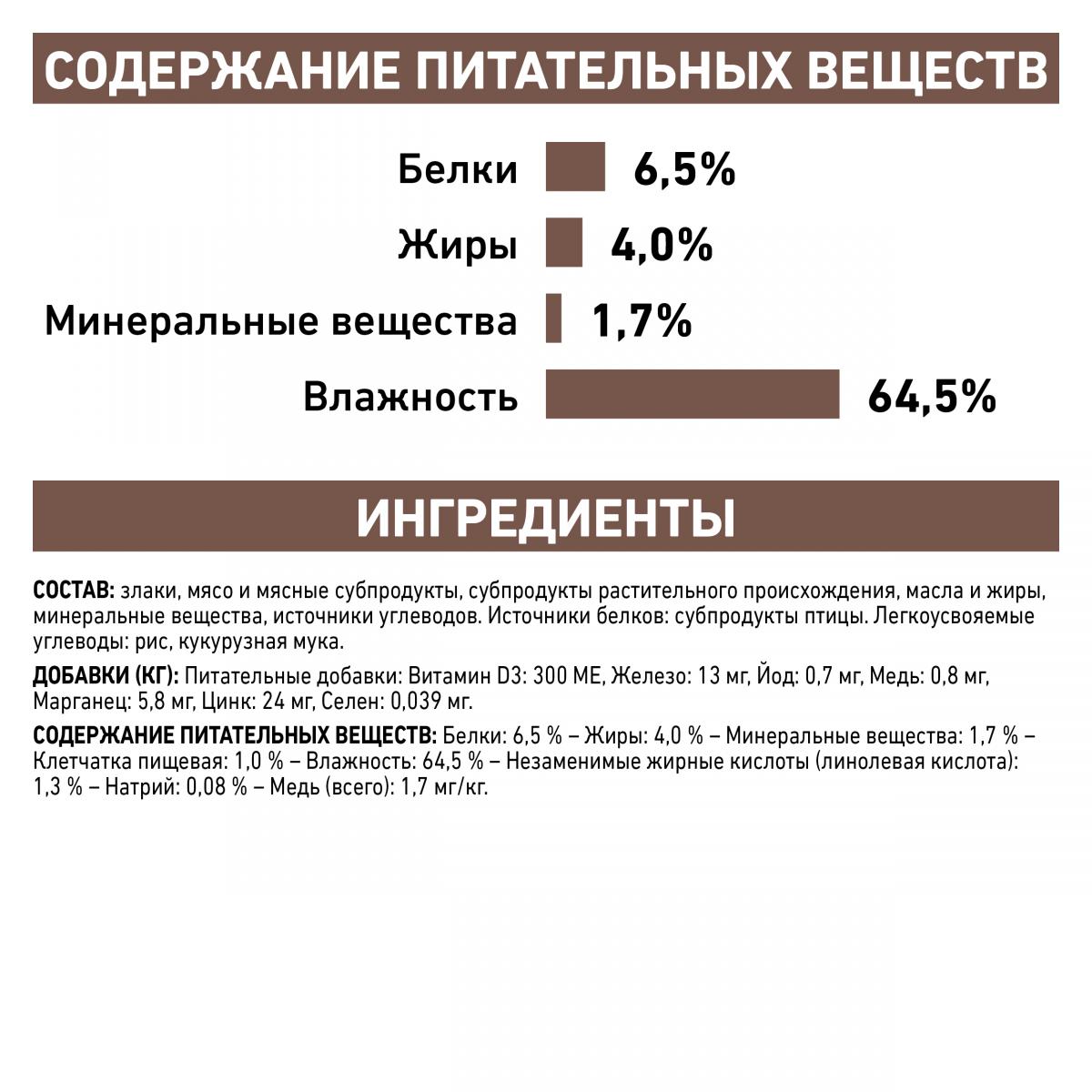 ИНГРЕДИЕНТЫ: злаки, мясо и мясные субпродукты, субпродукты растительного происхождения, масла и жиры, минеральные вещества, источники углеводов. Источники белков: субпродукты птицы. Легкоусвояемые углеводы: рис, кукурузная мука.